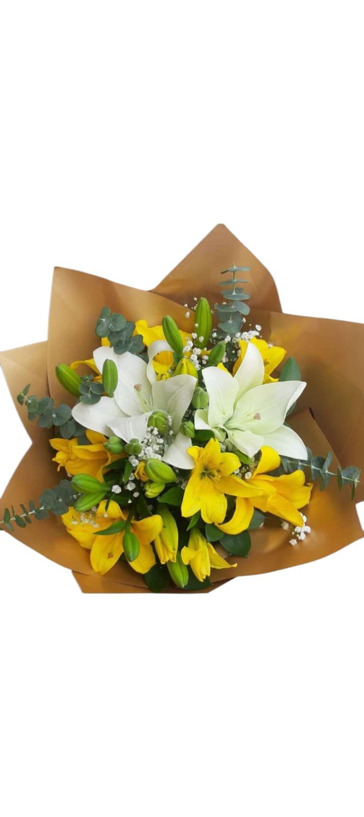Descubra la magia de la naturaleza con este encantador bouquet de lirios amarillos frescos y aromaticas ramas de eucalipto.